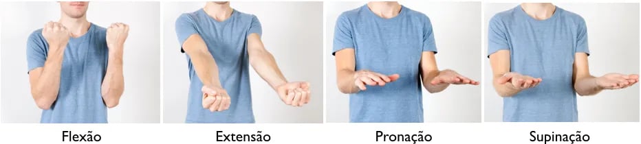 O cotovelo é responsável por quatro tipos de movimento: flexão (dobrar o cotovelo), extensão (esticar o cotovelo), pronação (virar a palma para baixo) e supinação (virar a palma para cima).